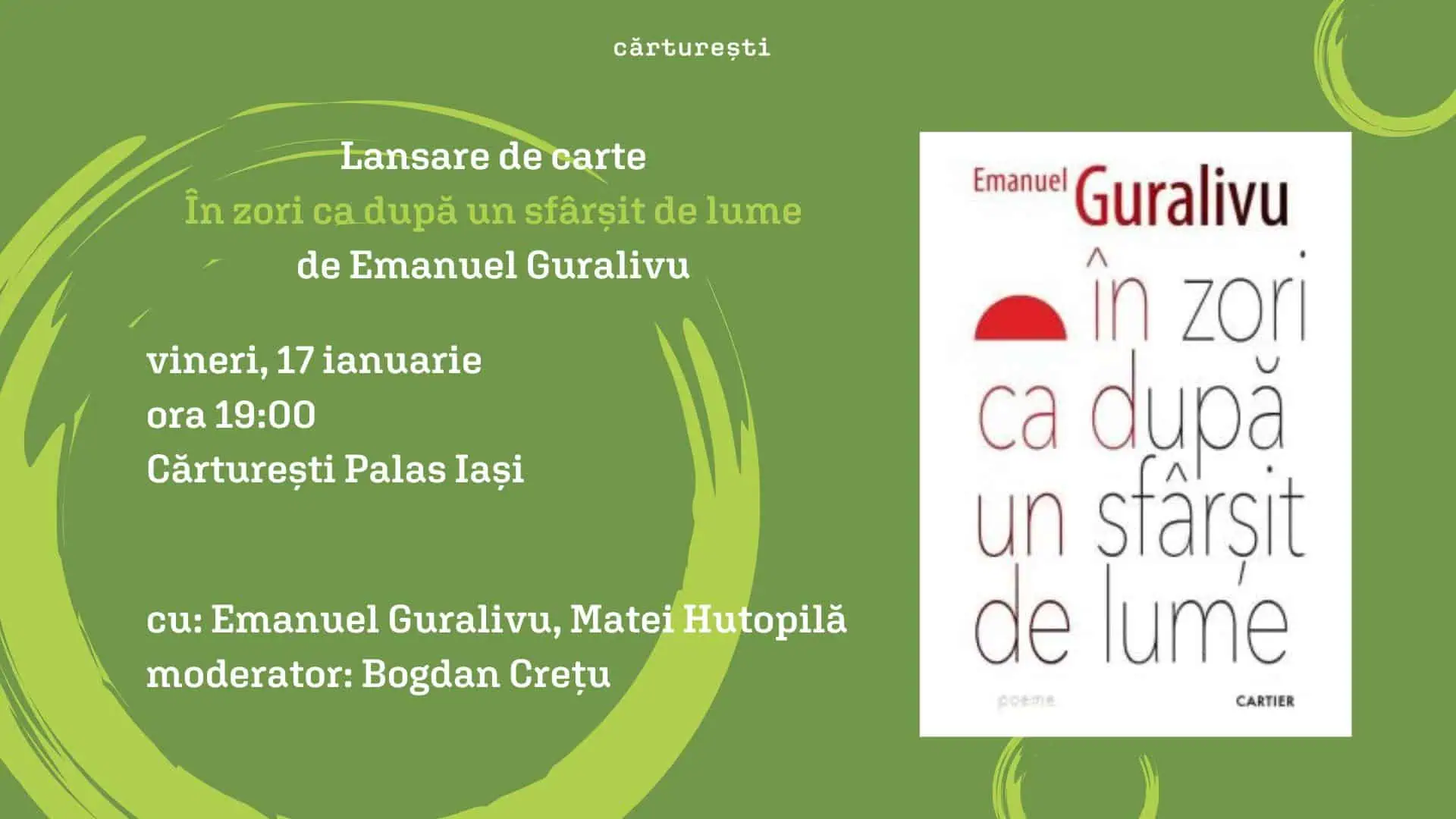 Vineri, 17 ianuarie, la ora 19.00, va avea loc lansarea volumului de poeme în zori ca după un sfârșit de lume, de Emanuel Guralivu, la Cărturești Pallas Iași (str. Palas 7A). Volumul a apărut la Editura Cartier, colecția Rotonda, coordonată de Emilian Galaicu-Păun.