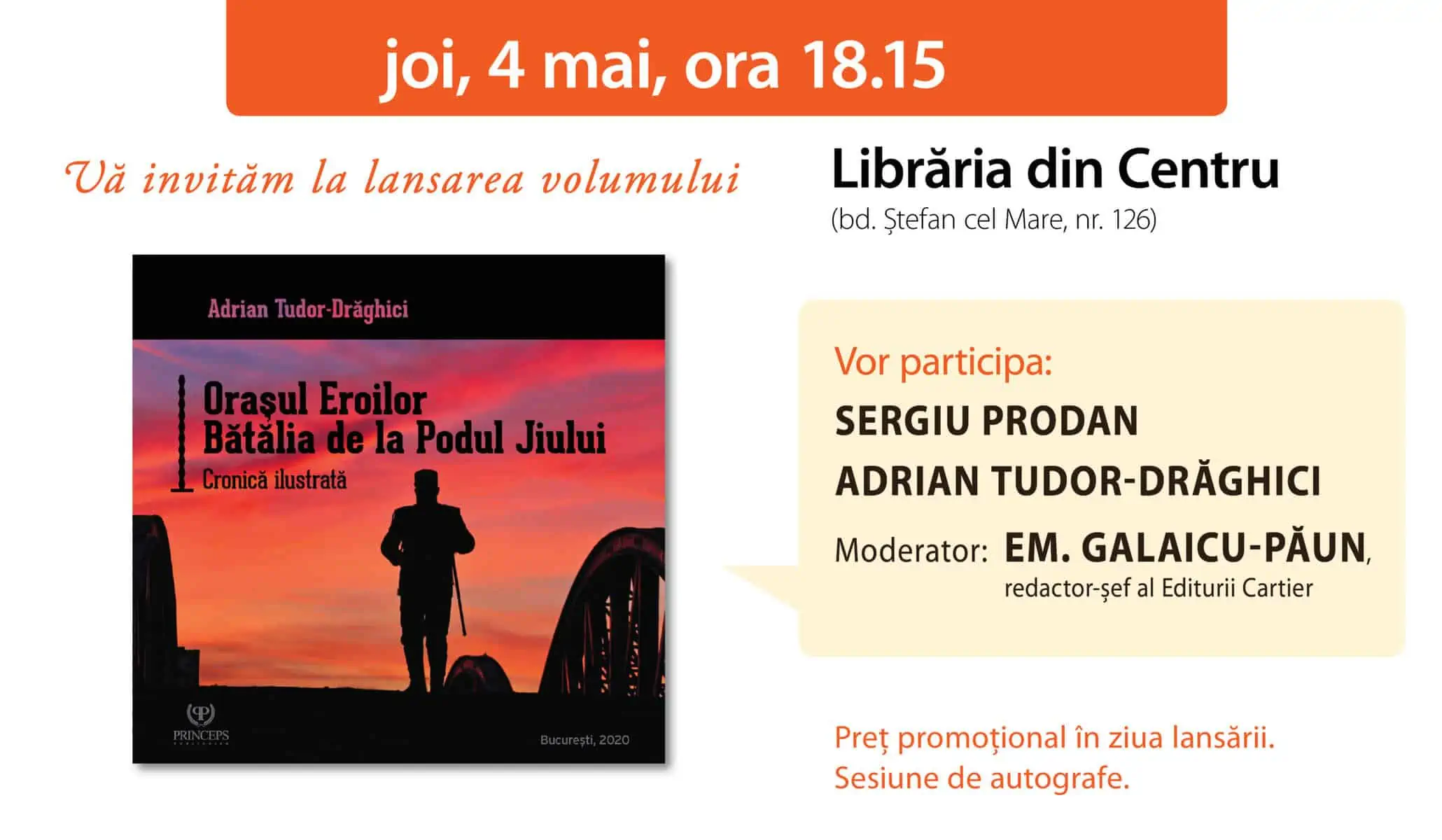 Joi, 4 mai crt, la ora 18.15, la Librăria din Centru (bd. Ștefan cel Mare, nr.126) din Chișinău, va avea loc lansarea volumului Orașul Eroilor. Bătălia de la Podul Jiului, de Adrian Tudor-Drăghici, apărut la Editura Princeps din București.