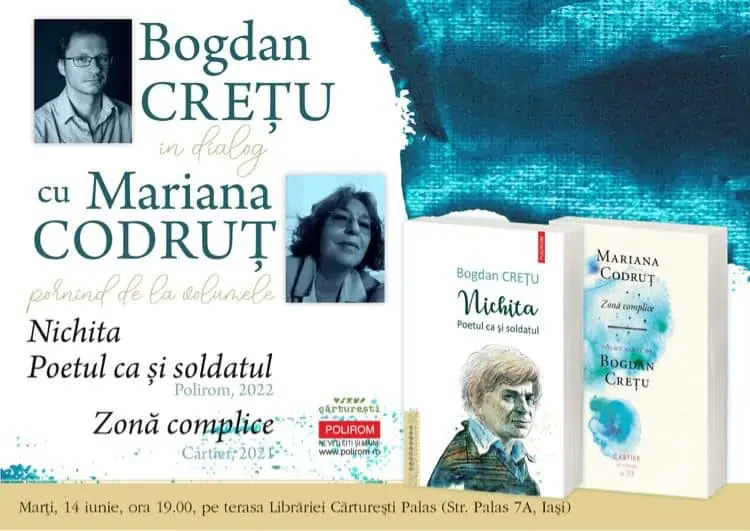 Marți, 14 iunie, la ora 19.00, pe terasa Librăriei Cărturești Palas din Iași (str. Palas, nr.7a), Bogdan Crețu va fi în dialog cu Mariana Codruț, pornind de la volumele Nichita. Poetul ca și soldatul, Editura Polirom, 2022 și Zonă complice, Editura Cartier, 2021.