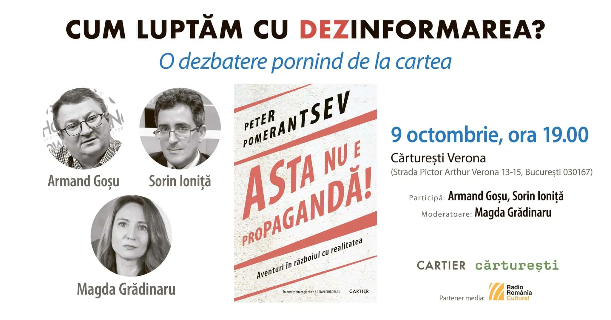Dezbaterea va porni de la volumul Asta nu e propagandă! Aventuri în războiul cu realitatea, de Peter Pomerantsev, cercetător în studiul informației la Universitatea John Hopkins. Cartea a apărut la Editura Cartier, în traducerea lui Adrian Ciubotaru.