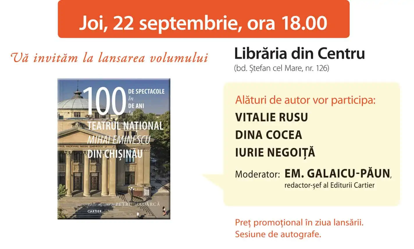 Joi, 22 septembrie crt, la ora 18.00, la Librăria din Centru (bd. Ștefan cel Mare, nr.126) din Chișinău, în cadrul Reuniunii Teatrelor Naționale de la Chișinău, va avea loc lansarea volumului 100 de spectacole în 100 de ani la Teatrul Național „Mihai Eminescu” din Chișinău, de Petru Hadârcă.