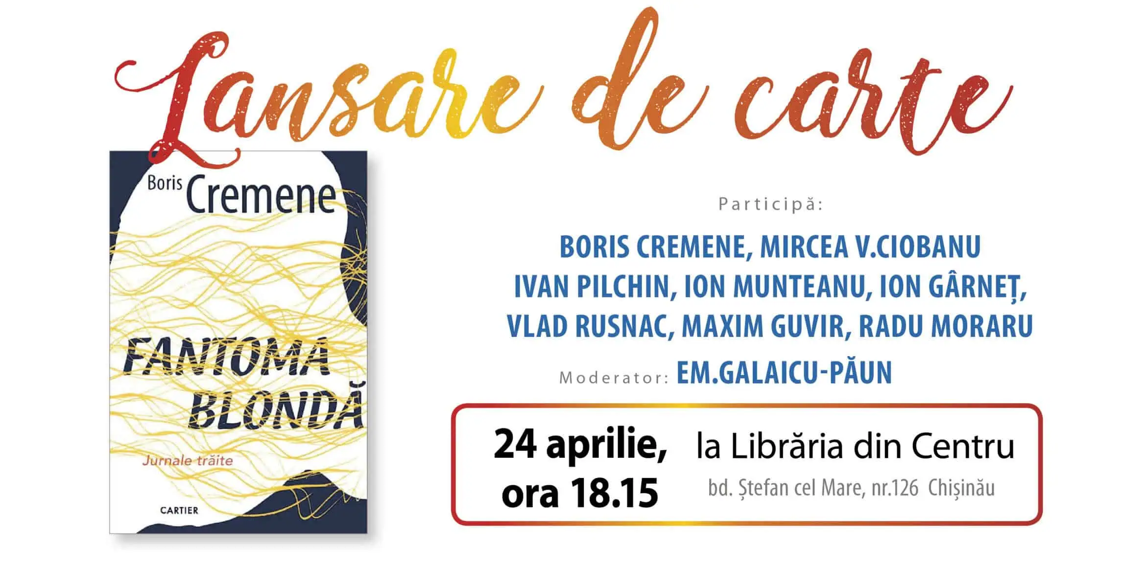 Joi, 24 aprilie crt, la ora 18.15, la Librăria din Centru (bd. Ștefan cel Mare, nr.126) din Chișinău, va avea loc lansarea volumului Fantoma blondă, de Boris Cremene, apărut la Editura Cartier în colecția Rotonda, coordonată de Em.Galaicu-Păun.