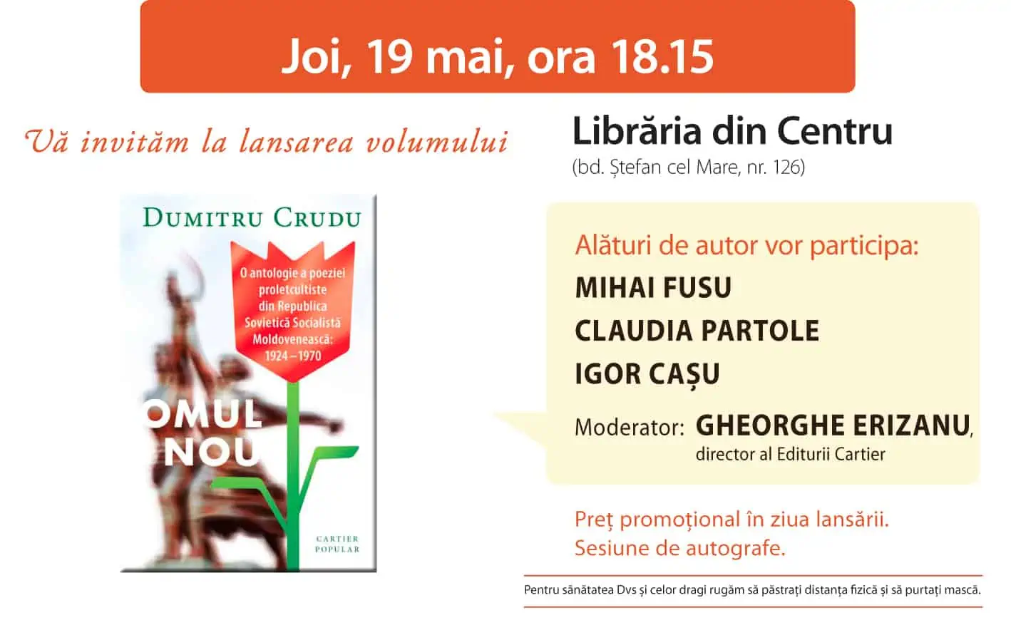 Joi, 19 mai, la ora 18.15, la Librăria din Centru (bd. Ștefan cel Mare, nr.126) din Chișinău, va avea loc lansarea volumului Omul nou. O antologie a poeziei proletcultiste din RSS Moldovenească: 1924 – 1970, de Dumitru Crudu. Volumul a apărut la Editura Cartier, în colecția Cartier popular.