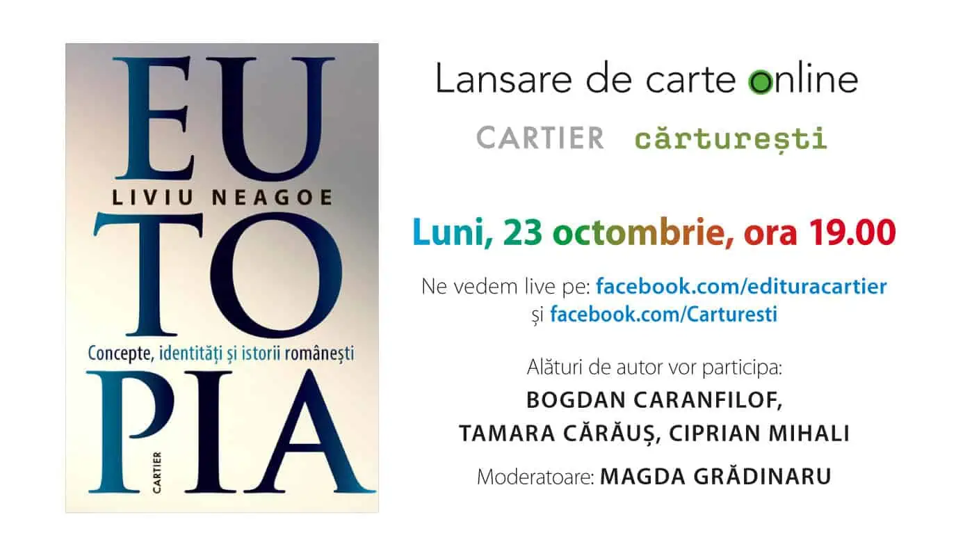 Luni, 23 octombrie, la ora 19.00, va avea loc lansarea online a volumului Eutopia. Concepte, identități și istorii românești, de Liviu Neagoe, proaspăt apărut la Editura Cartier.