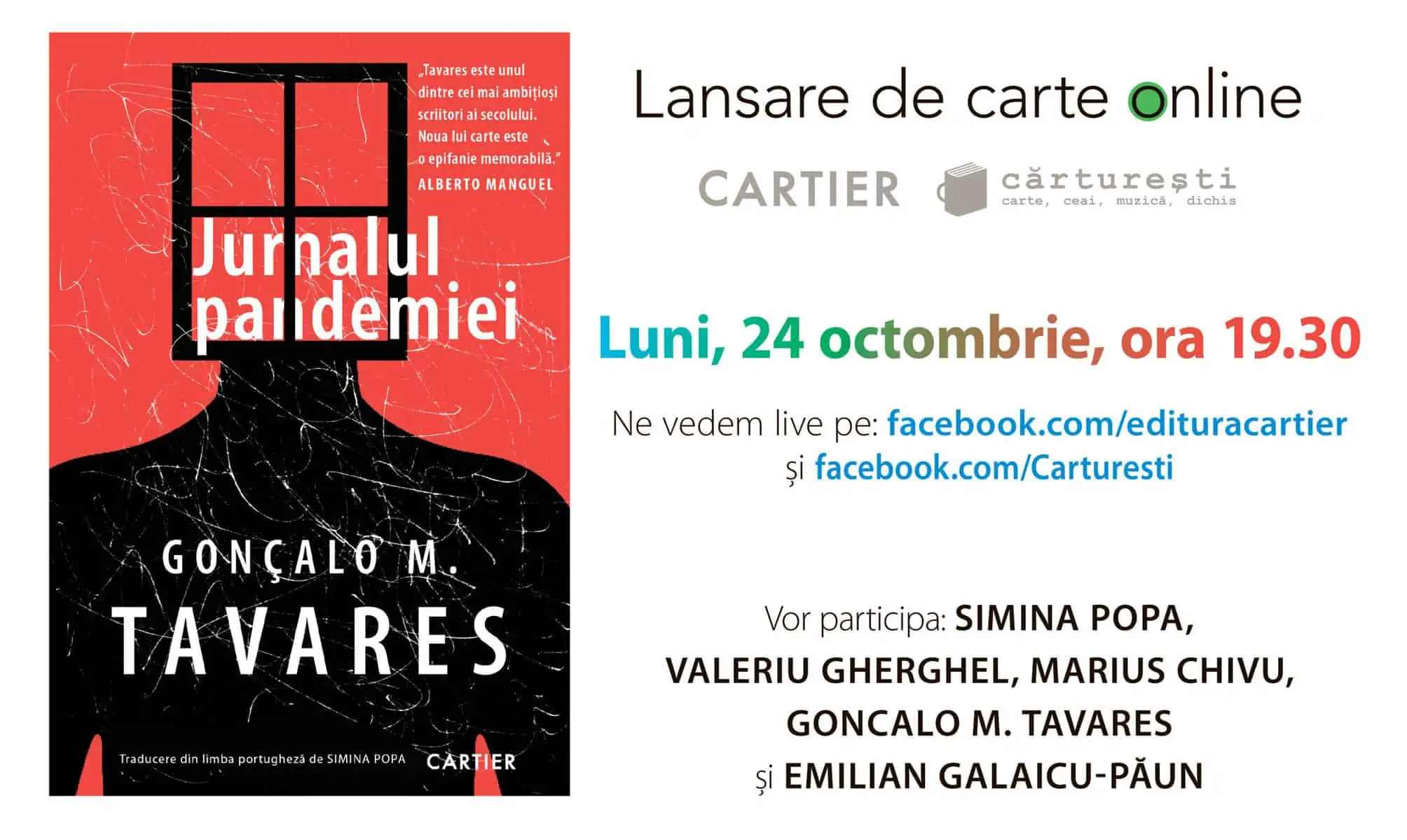 Luni, 24 octombrie, ora 19.30, vă invităm la lansarea online a volumului Jurnalul pandemiei, de Goncalo M. Tavares, traducere din portugheză de Simina Popa, apărut la Editura Cartier, colecția Biblioteca deschisă.