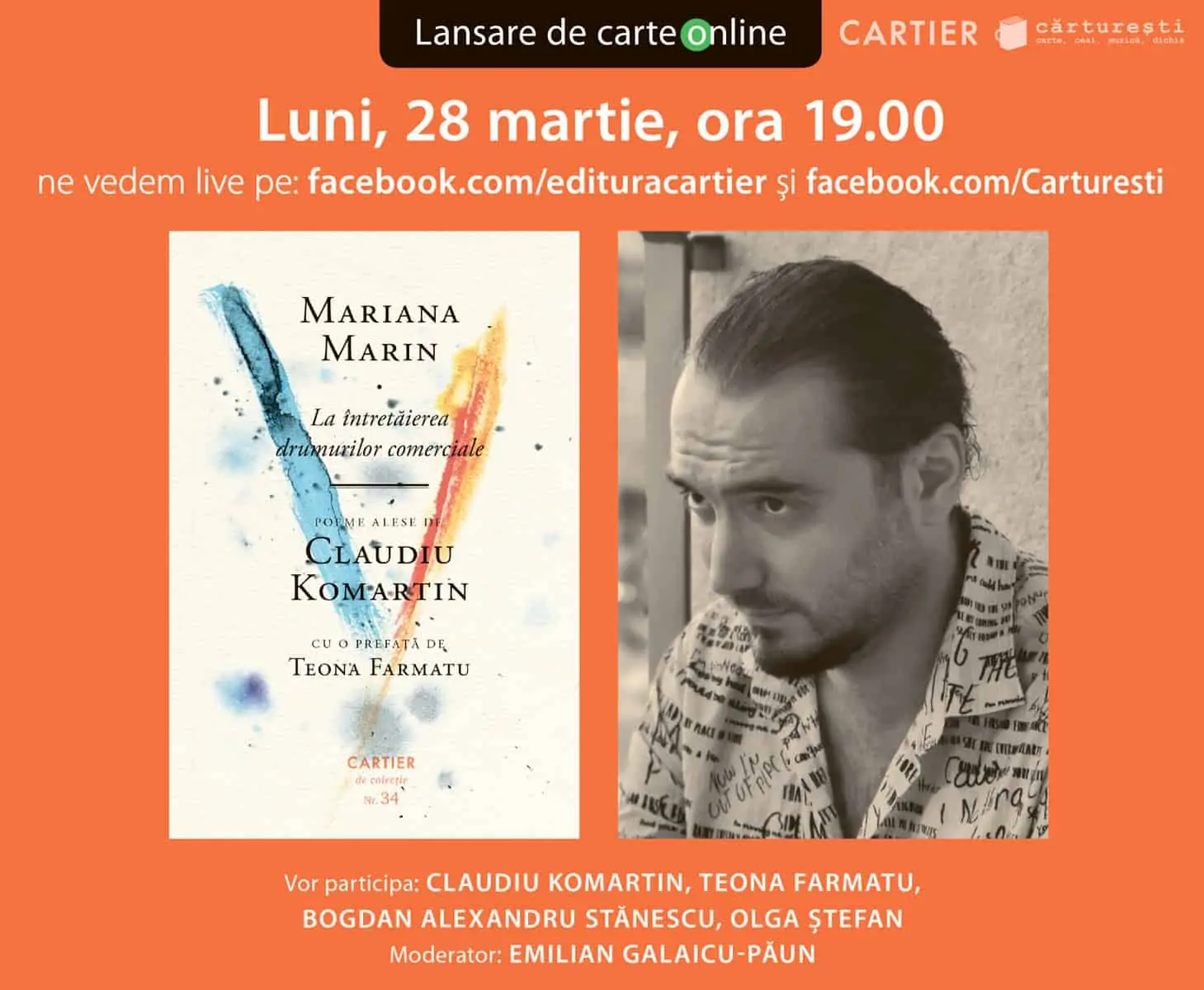 Luni, 28 martie, la ora 19.00, vă invităm la lansarea online a antologiei Mariana Marin. La întretăierea drumurilor comerciale, poeme alese de Claudiu Komartin, cu o prefață de Teona Farmatu, fotografii de Ana Toma, apărută la Editura Cartier, în Cartier de colecție, volumul nr.34. Apărut cu sprijinul AFCN.