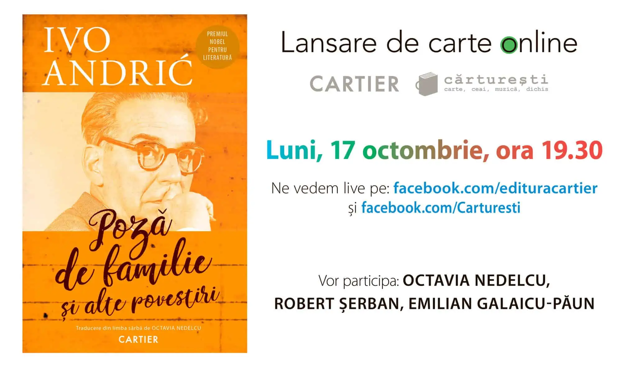 Luni, 17 octombrie, ora 19.30, vă invităm la lansarea online a volumului Poză de familie și alte povestiri, de Ivo Andric, traducere din sârbă de Octavia Nedelcu, apărut la Editura Cartier în colecția Biblioteca deschisă.