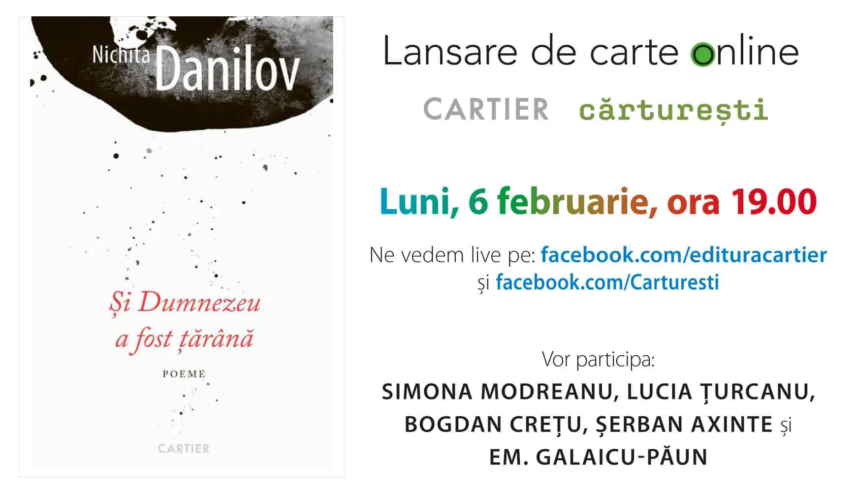 Luni, 6 februarie, ora 19.00, vă invităm la lansarea online a volumului de poeme Și Dumnezeu a fost țărână, de Nichita Danilov, apărut la Editura Cartier, colecția Rotonda.