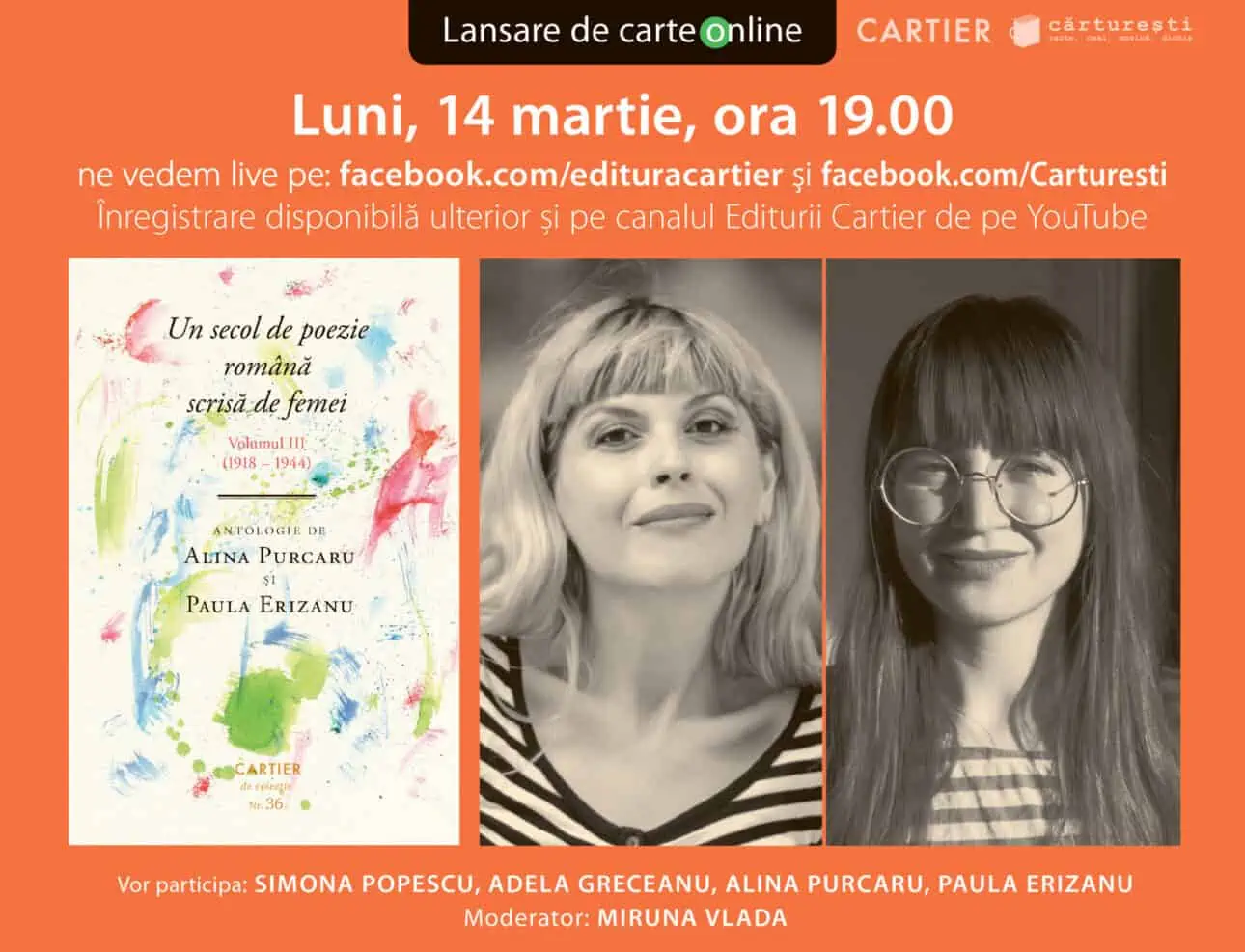 Luni, 14 martie, ora 19.00, vă invităm la lansarea online a volumului III al antologiei Un secol de poezie română scrisă de femei (1918-1944), de Alina Purcaru și Paula Erizanu, cu fotografii de Maria Guțu. Vor participa la dialogul despre acest proiect de recuperare a vocilor poetelor interbelice :