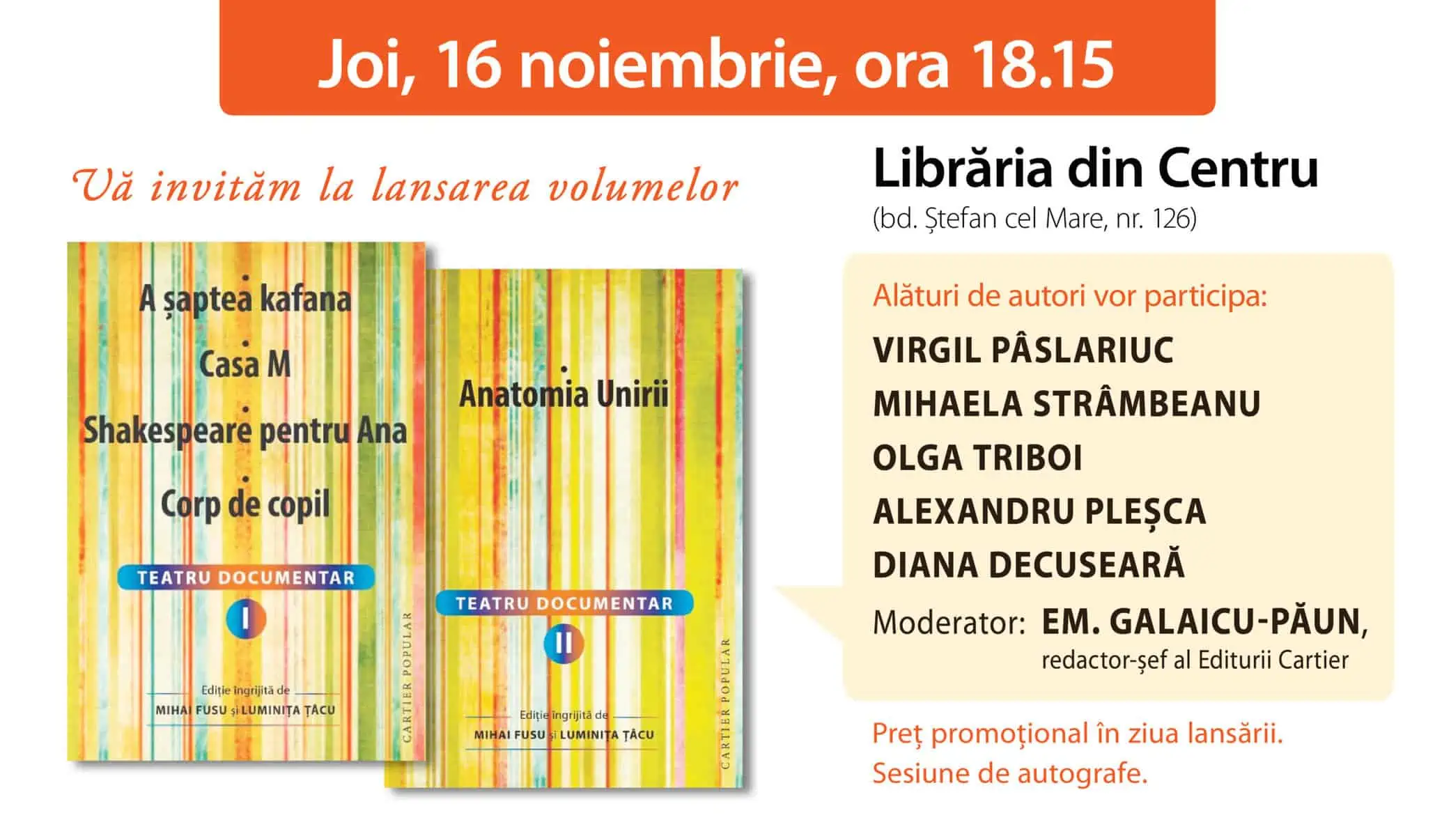 Joi, 16 noiembrie crt, la ora 18.15, la Librăria din Centru (bd. Ștefan cel Mare, nr.126) din Chișinău, va avea loc lansarea volumelor Teatru documentar (2 vol), de Mihai Fusu și Luminița Tâcu, apărute la Editura Cartier în colecția Cartier popular.