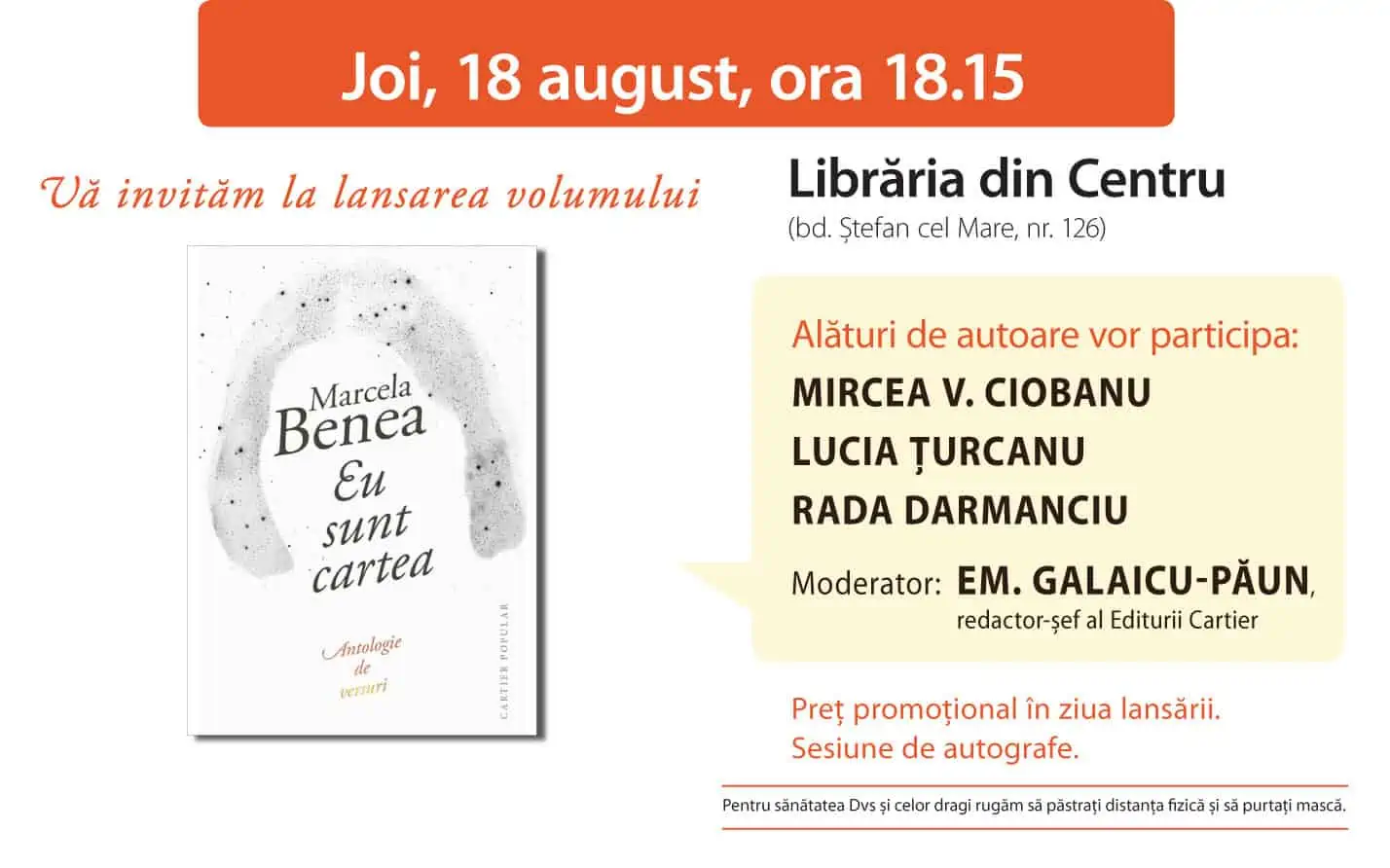 Joi, 18 august crt, la ora 18.15, la Librăria din Centru (bd. Ștefan cel Mare, nr.126) din Chișinău, va avea loc lansarea antologiei Eu sunt cartea, de Marcela Benea, volum care o consacră pe Marcela Benea ca pe o voce de vârf a generației sale și a poeziei scrise de femei în Republica Moldova. Antologia a apărut la Editura Cartier în colecția Cartier popular.