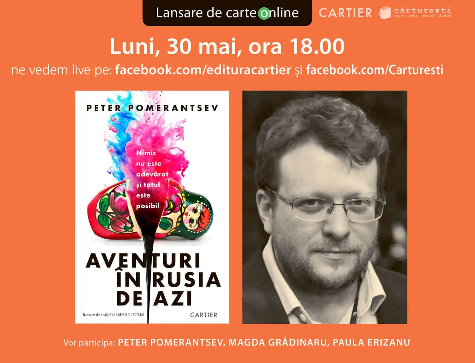 Luni, 30 mai, la ora 18.00, vă invităm la lansarea online a volumului Aventuri în Rusia de azi. Nimic nu este adevărat și totul este posibil, de Peter Pomerantsev, traducere din engleză de Adrian Ciubotaru. Vor participa, alături de autor, jurnalistele Magda Grădinaru și Paula Erizanu. Discuția va avea loc în limba engleză și va fi transmisă live, pe paginile facebook ale Editurii Cartier și Librăriilor Cărturești.