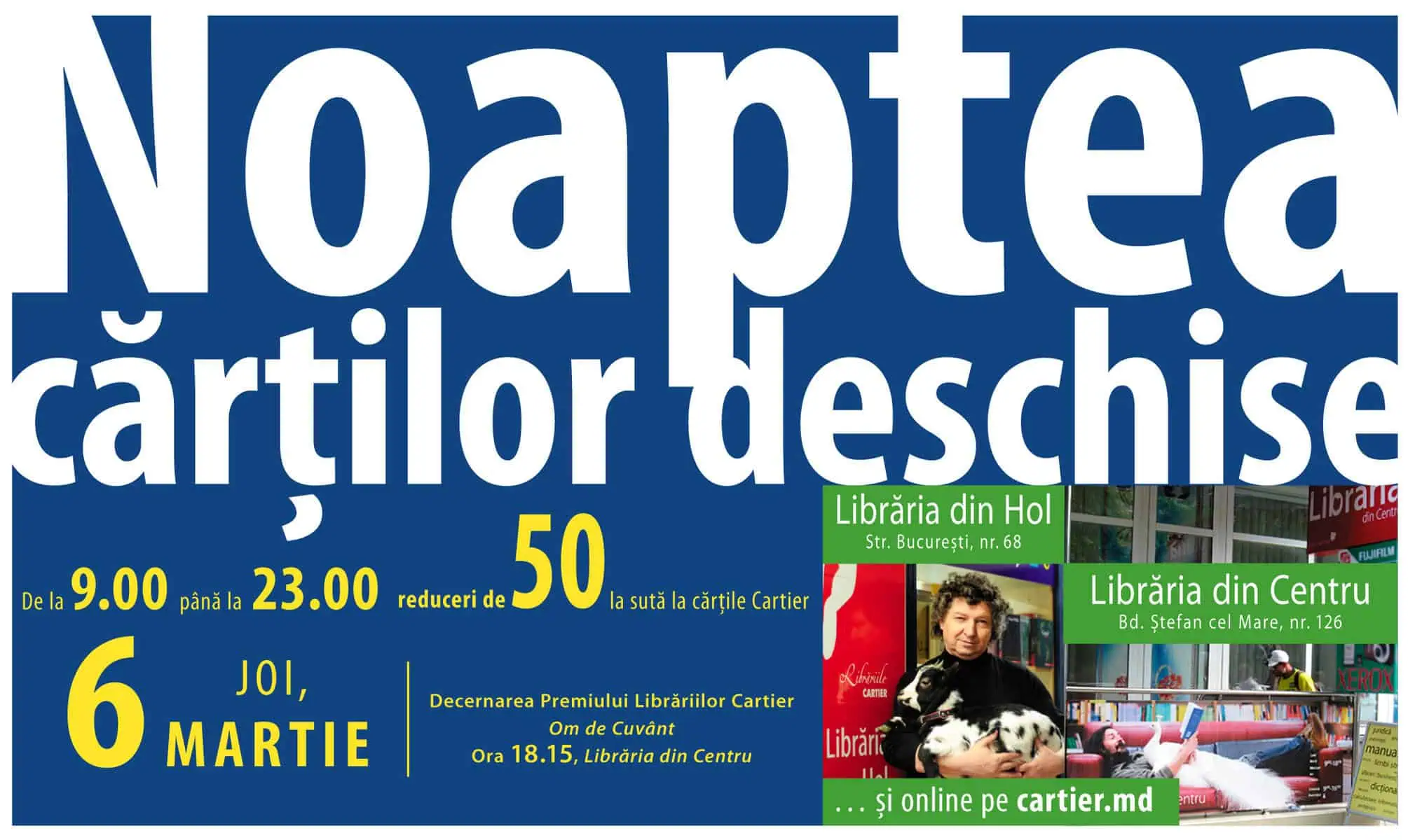 Cu această ocazie, joi, 6 martie crt, în Librăriile Cartier va avea loc Noaptea Cărților Deschise, ediția a XVI-a. Cărțile Cartier se vor vinde la jumătate de preț (Librăria din Centru, b-dul Ștefan cel Mare nr.126 și Librăria din Hol, str. București nr.68 și de pe cartier.md, librăria noastră online, cu livrare prin curieri).