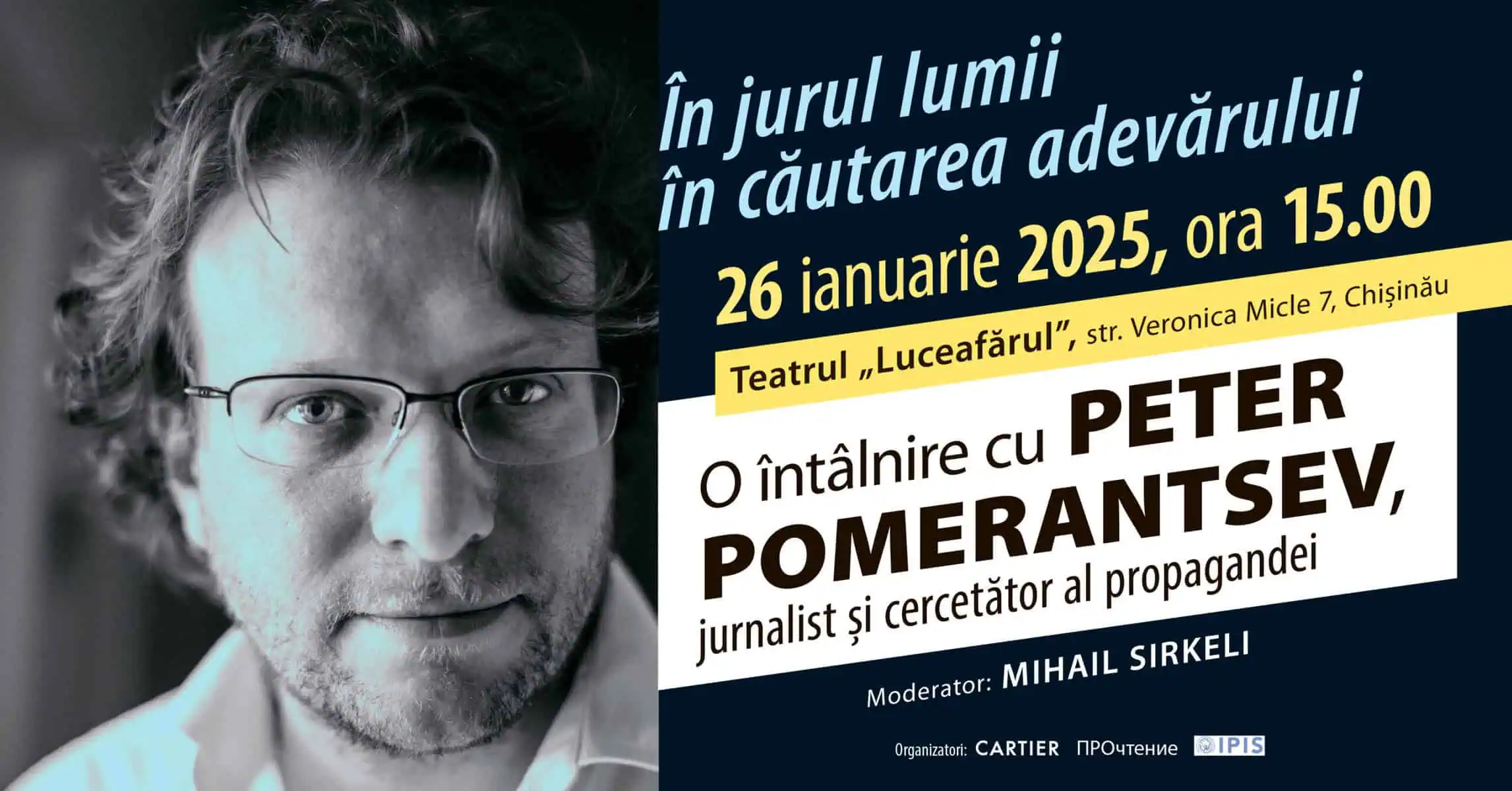 Duminică, 26 ianuarie, Chișinăul se va bucura de prezența unui invitat special: jurnalistul și cercetătorul Peter Pomerantsev, autor al volumelor premiate „Aventuri în Rusia de azi. Nimic nu este adevărat și totul este posibil, „Asta nu e propagandă! Aventuri în războiul cu realitatea” și „Cum să câștigi un război informațional. Propagandistul care l-a păcălit pe Hitler.”