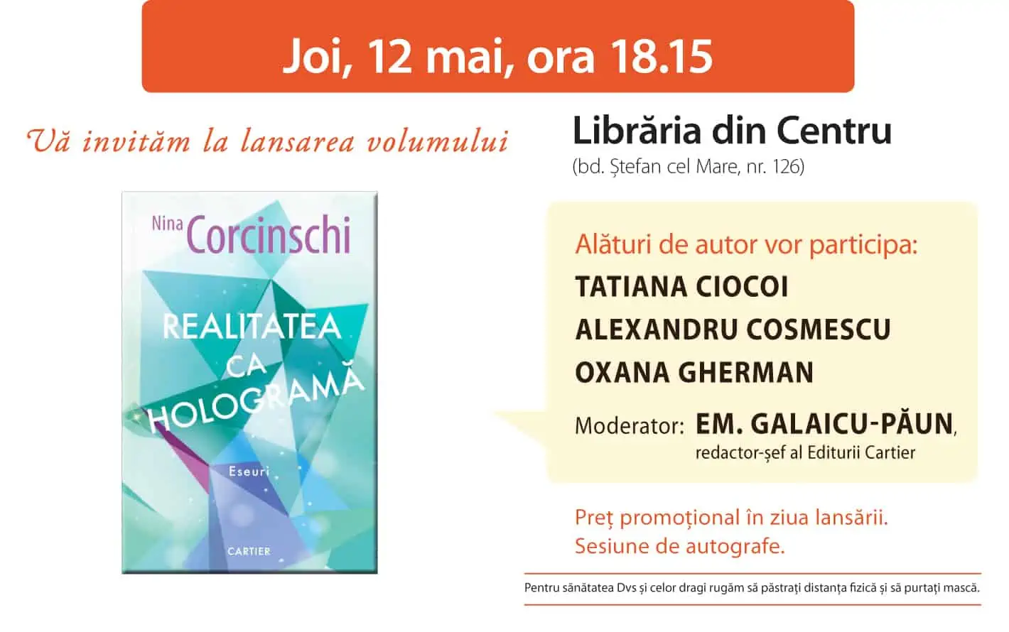 Joi, 12 mai crt, la ora 18.15, la Librăria din Centru (bd. Ștefan cel Mare, nr.126) din Chișinău, va avea loc lansarea volumului Realitatea ca hologramă, de Nina Corcinschi, apărut la Editura Cartier în colecția Rotonda, coordonată de Emilian Galaicu-Păun.