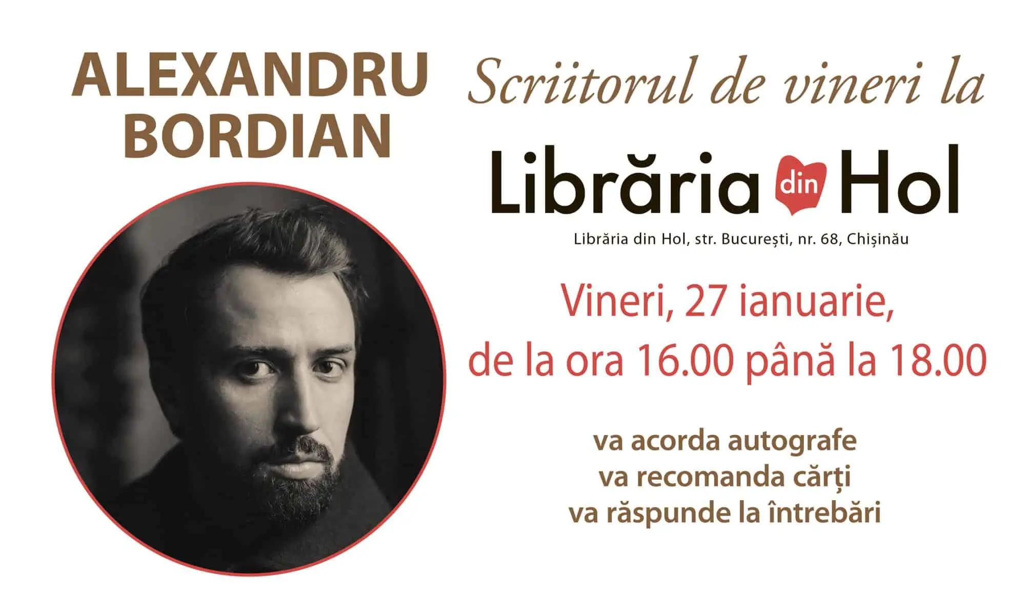 Vineri, 27 ianuarie, de la 16.00 până la 18.00, la Librăria din Hol (str.București, nr.68, Chișinău), scriitorul de vineri va oferi autografe, va recomanda cărți, vă răspunde la întrebările voastre și va fi printre cititori.
