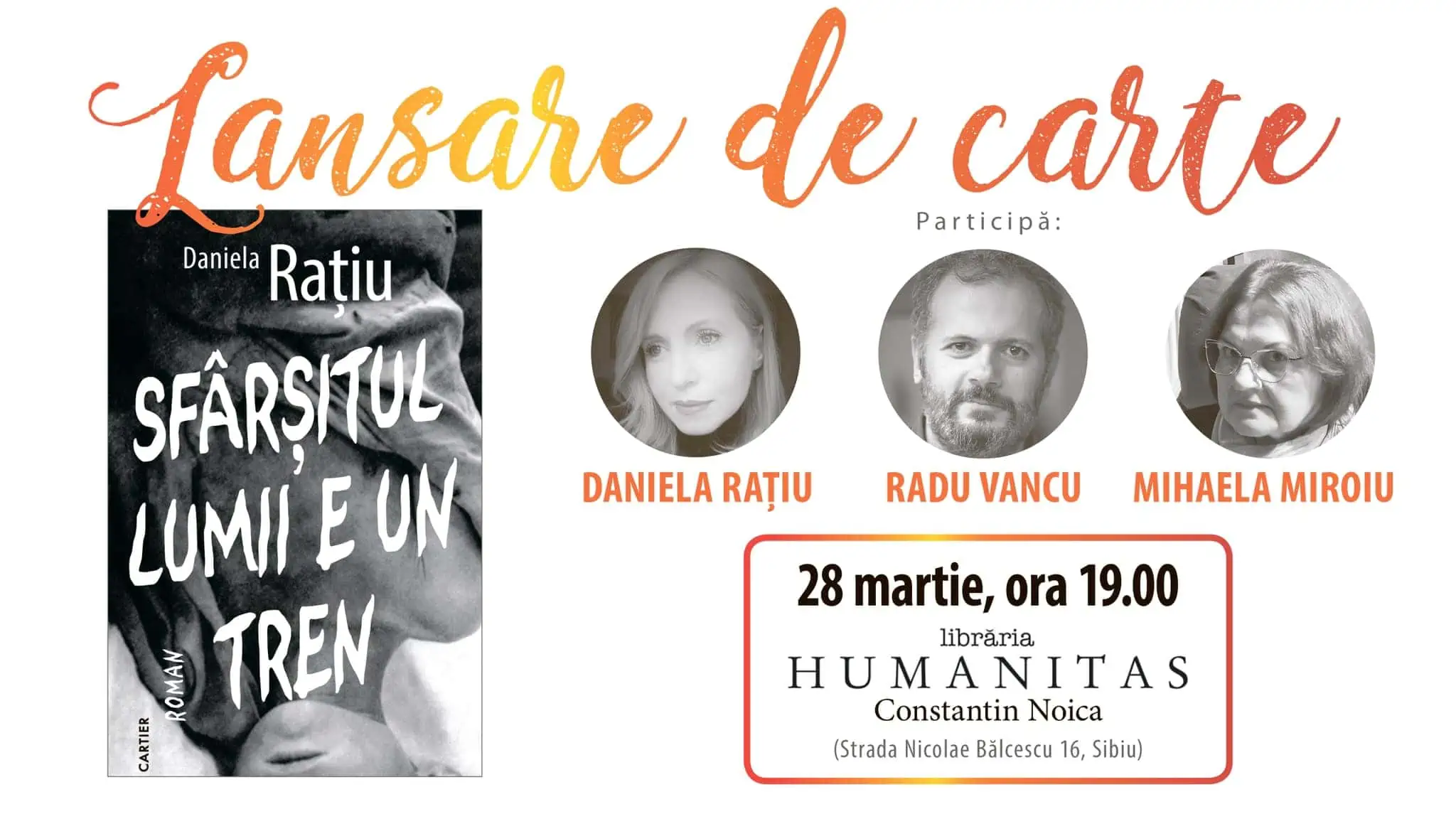 Prieteni din Sibiu, joi, 28 martie, la ora 19.00, la librăria Humanitas Constantin Noica, vă invităm la o întâlnire cu scriitorii Daniela Rațiu, Radu Vancu și Mihaela Miroiu, cu prilejul apariției romanului „Sfârșitul lumii e un tren”, editura Cartier, – o carte care invocă foametea de după cel de-Al Doilea Război Mondial.
