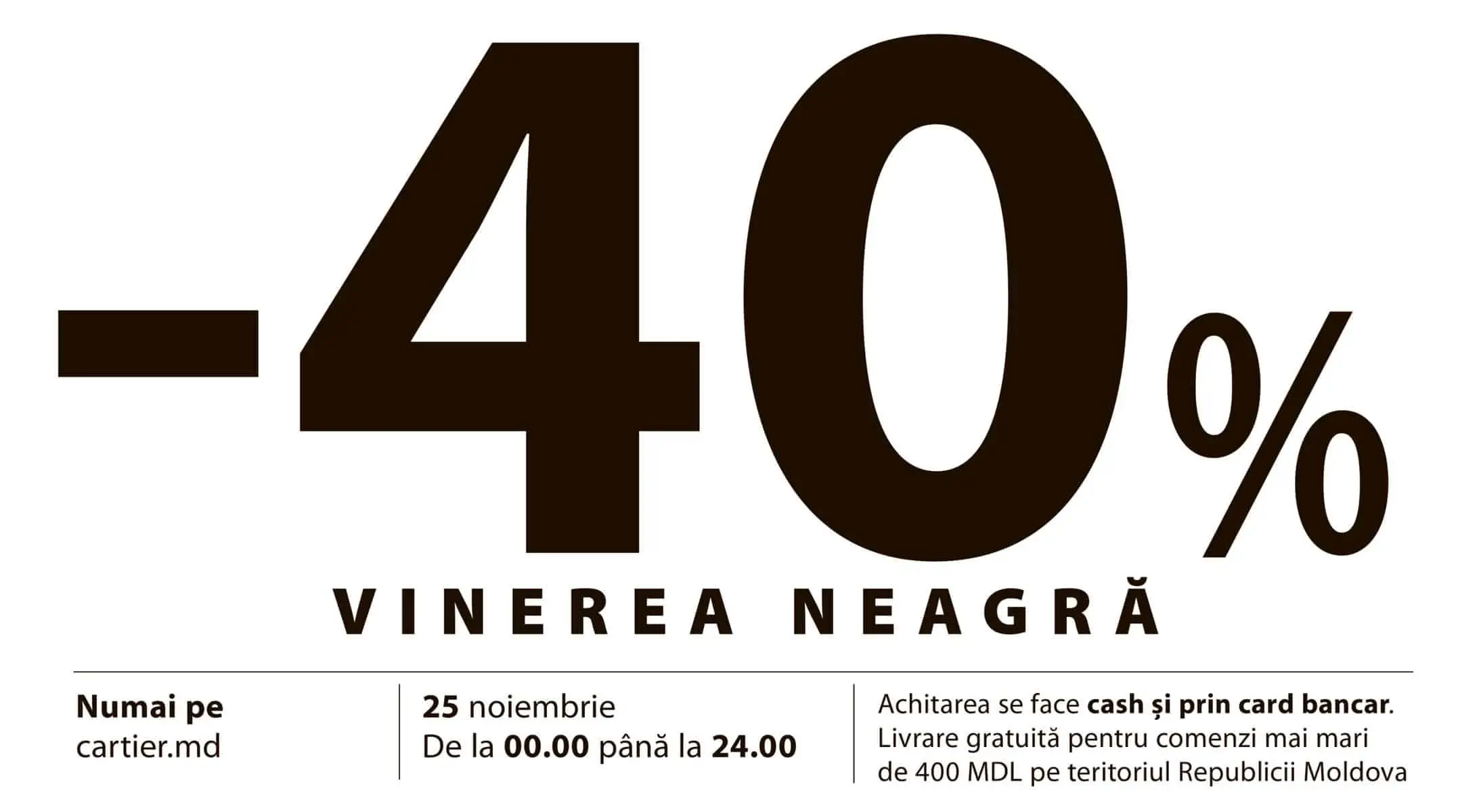 Vineri, 25 noiembrie, cărțile Cartier se vor vinde la 60% din prețul de pe copertă în Librăria online Cartier: cartier.md .