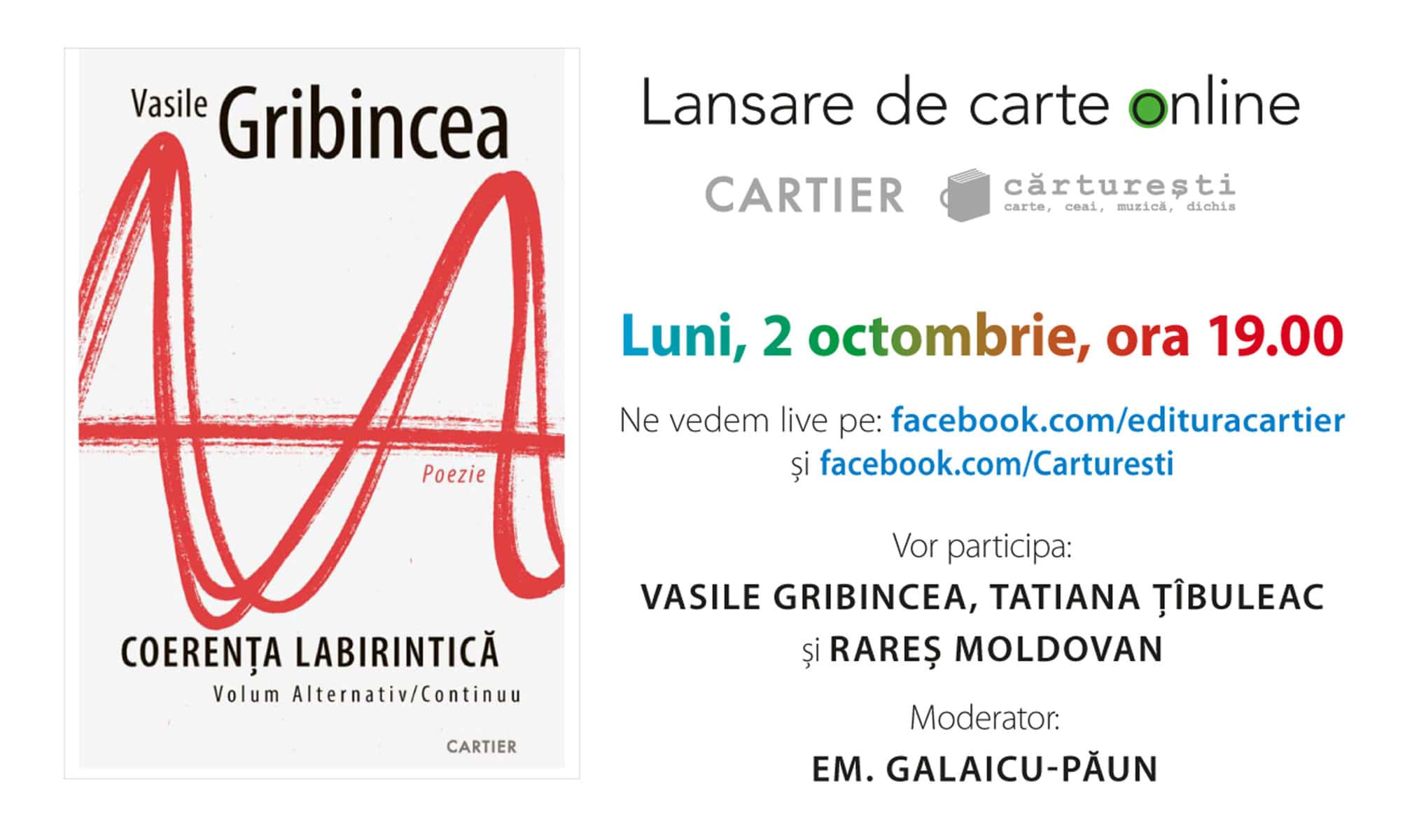 Vezi mai mult 2 octombrie Lansare de carte online: Coerența labirintică, de Vasile Gribincea Online 19:30 - 20:30