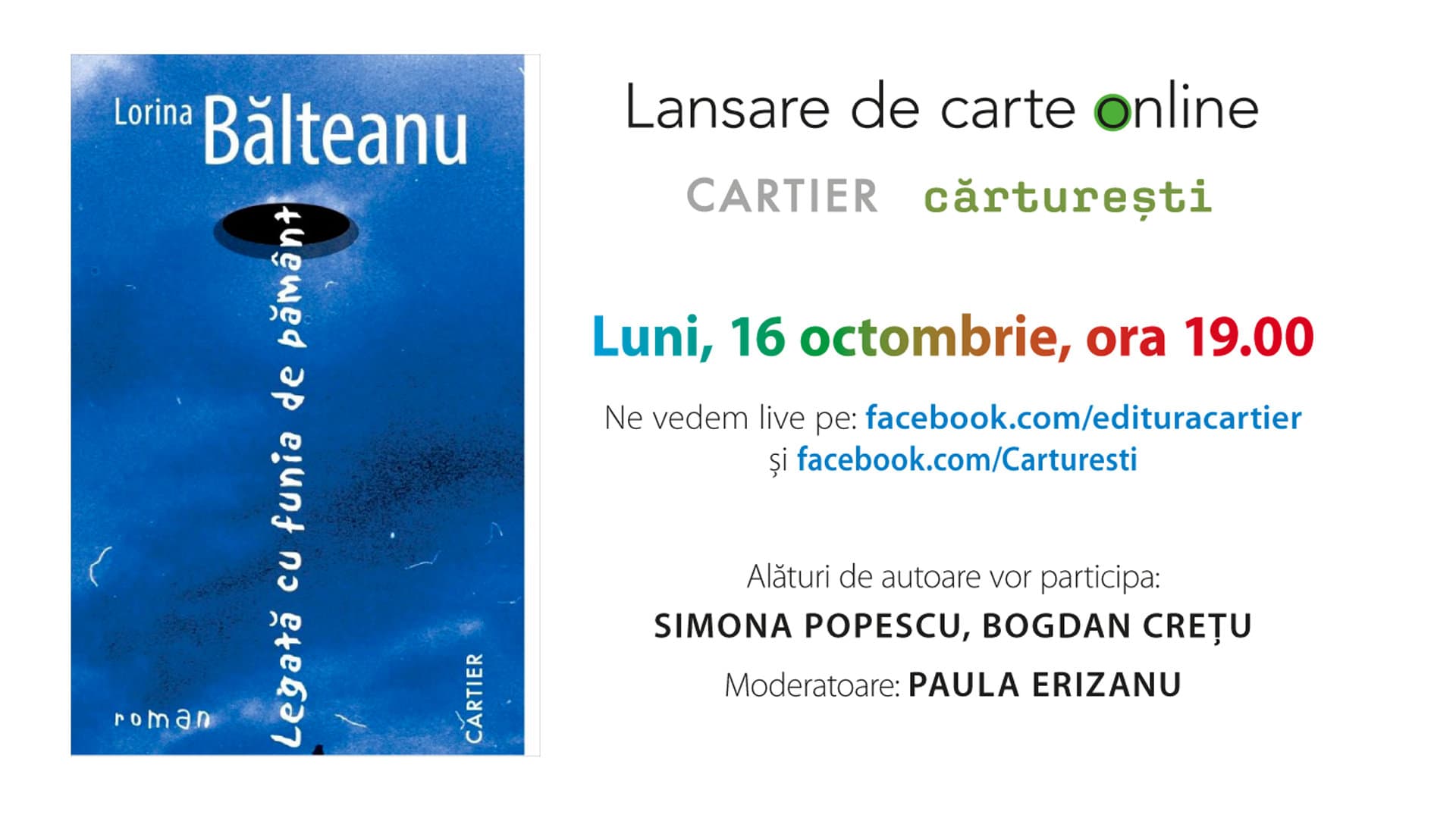 Vezi mai mult 16 octombrie Lansare de carte online: Legată cu funia de pământ, de Lorina Bălteanu Online 19:00 - 20:00
