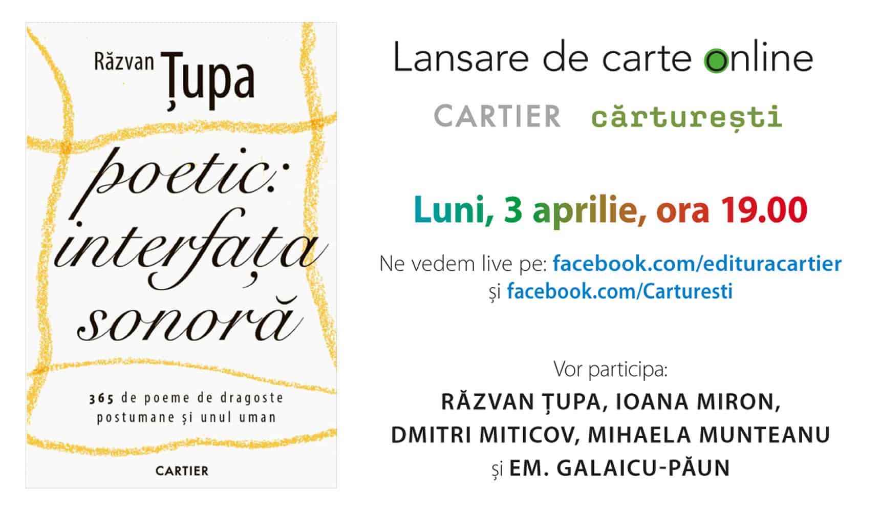 Vezi mai mult 3 aprilie Lansare de carte online: poetic: interfață sonoră, de Răzvan Țupa Online 19:00 - 20:00