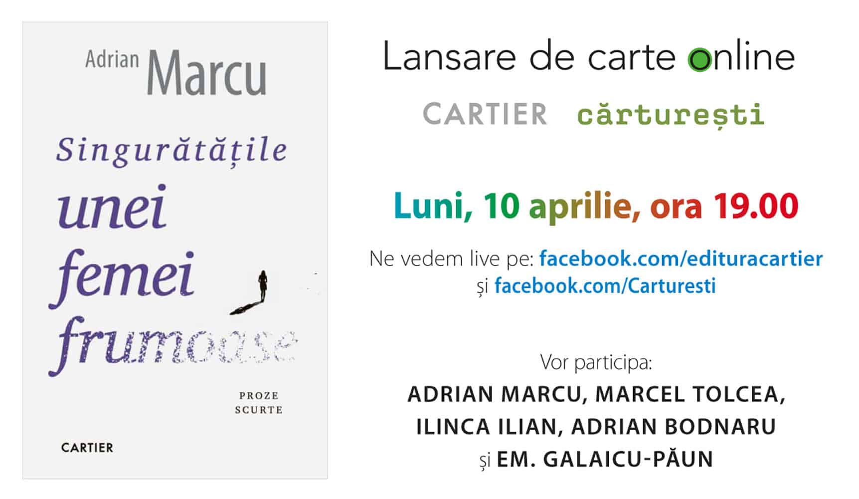 Vezi mai mult 10 aprilie Lansare de carte online: Singurătățile unei femei frumoase, de Adrian Marcu Online 19:00 - 20:00