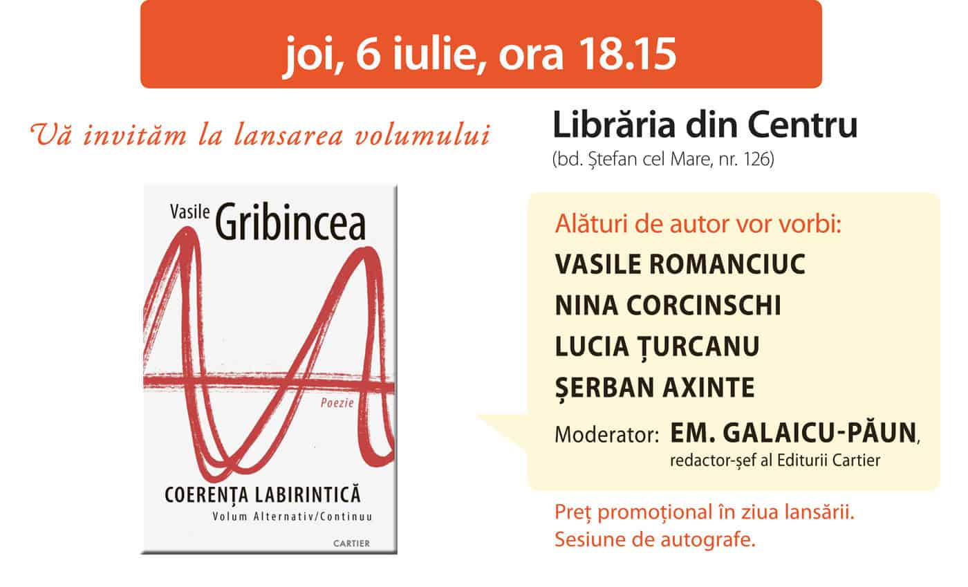Vezi mai mult 6 iulie Coerența labirintică, de Vasile Gribincea, la Librăria din Centru bd.Ștefan cel Mare și Sfânt, nr. 126 Chișinău, 2060 Moldova, Republic of 18:15 - 19:30