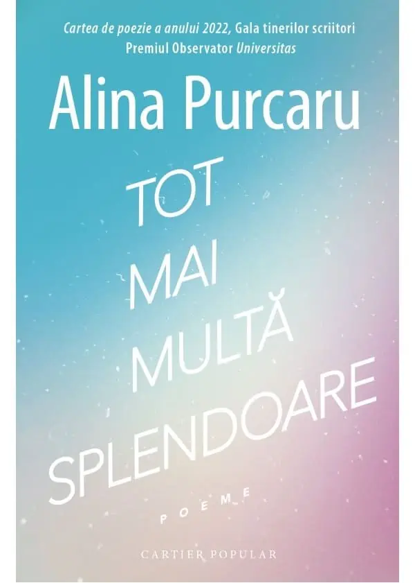 „Din poemele Alinei Purcaru răzbat vocile copiilor dintr-un timp salvat „în fiole sparte de algocalmin”, hipervigilența corpului „predispus să simtă frica”, vina și neputința, „sunetul oceanului” și efectul „anesteziant” al unor „boabe de rouă”, contrastul dintre deșeuri și munții „mereu cu zăpadă pe creste.” Tot mai multă splendoare compune o istorie fragilă și intimă a corpului condiționat, fragmentat, „desprins în alt fel”; o carte în care viața încolțește în pofida condițiilor, o carte a rememorării, a căutării de sine, a libertății și pasiunii. (Medeea Iancu)